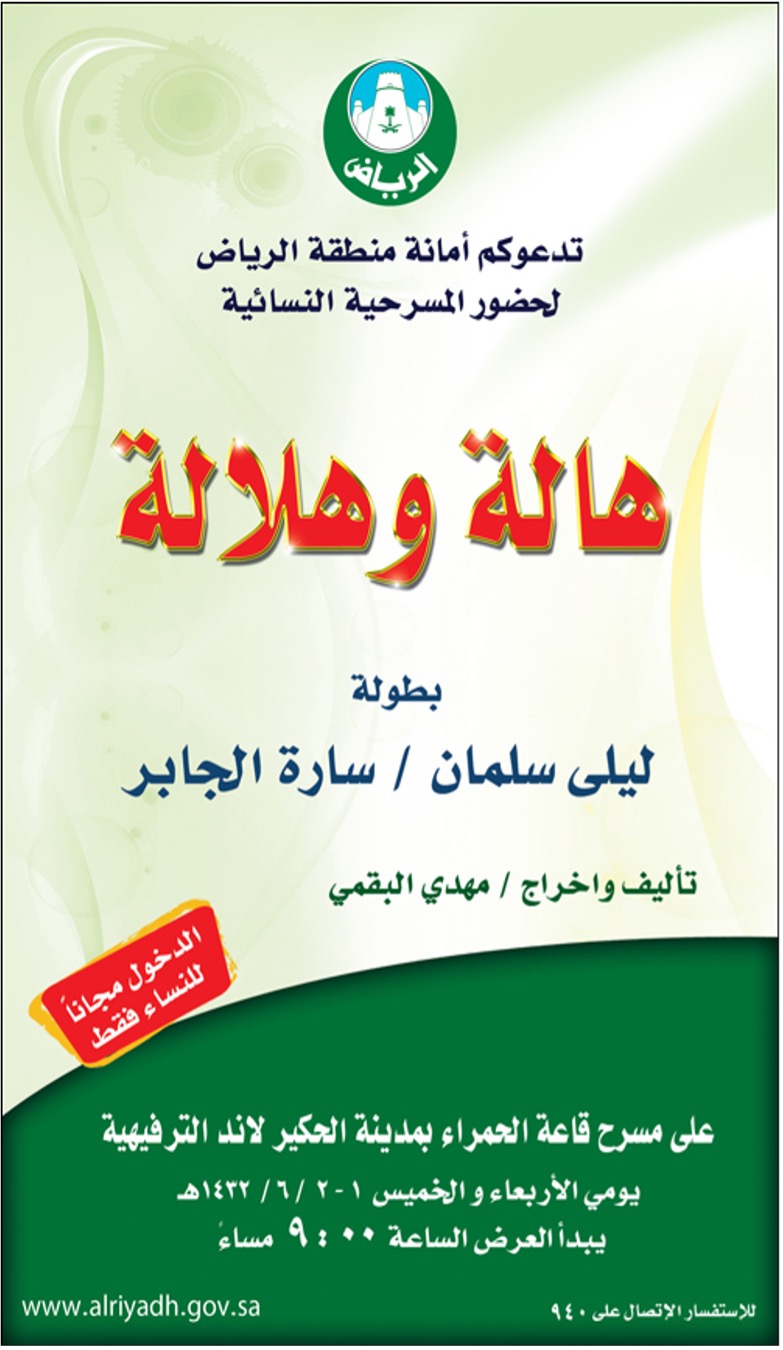 - مسرحية هاله وهلالة : عام (2010) عرضت في مدينة الرياض ومدينة جدة.