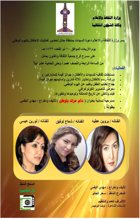 - مسرحية سعودوني : عام (2012) عرضت في محافظة ينبع على مسرح الغرفة التجارية من بطولة الفنانه البحرينية / شيخه زويد والفنانة شعاع توفيق والفنانة إيمان سليم.